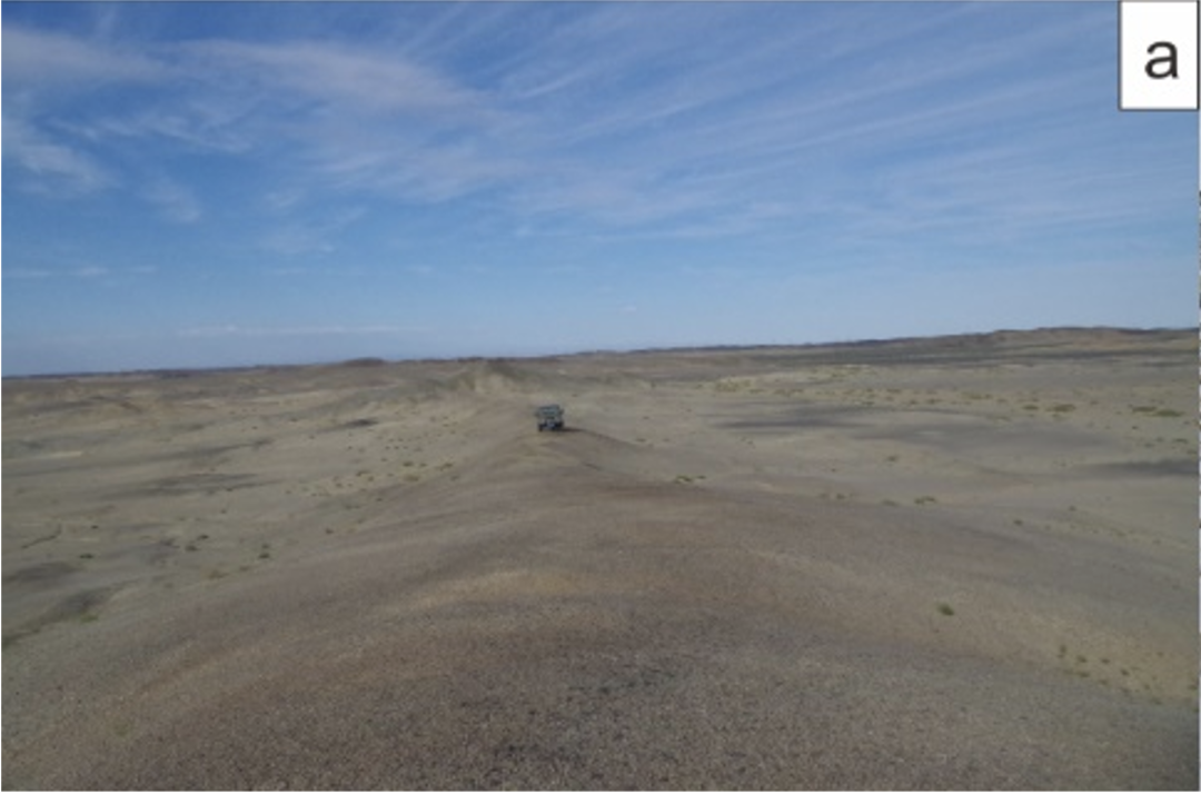 (a) 研究团队在库姆塔格沙漠开展陨石收集工作;