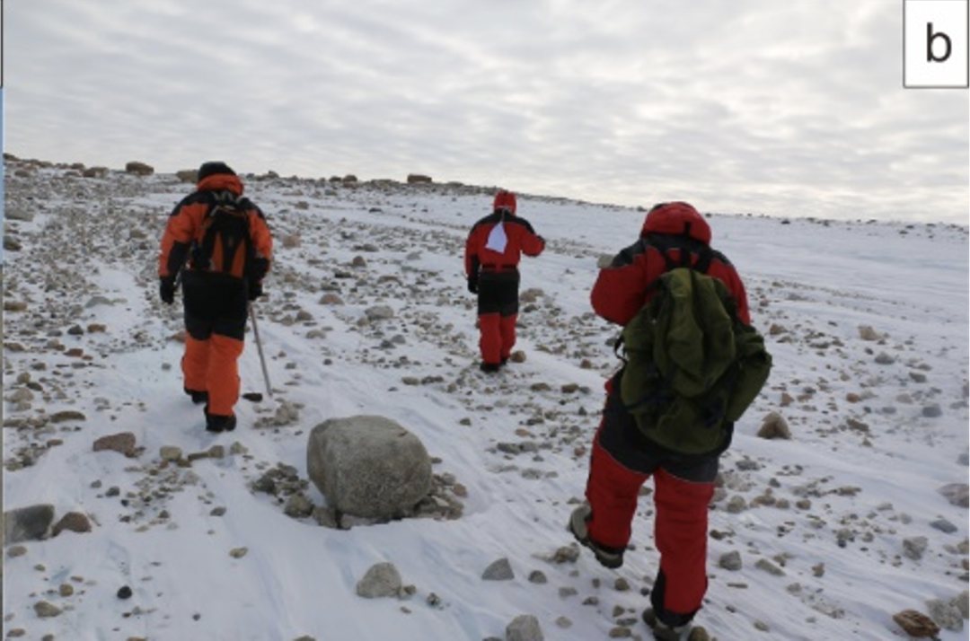 (b) 南极科考队员们正在格罗夫山寻找陨石 (来源:中国国家天文)