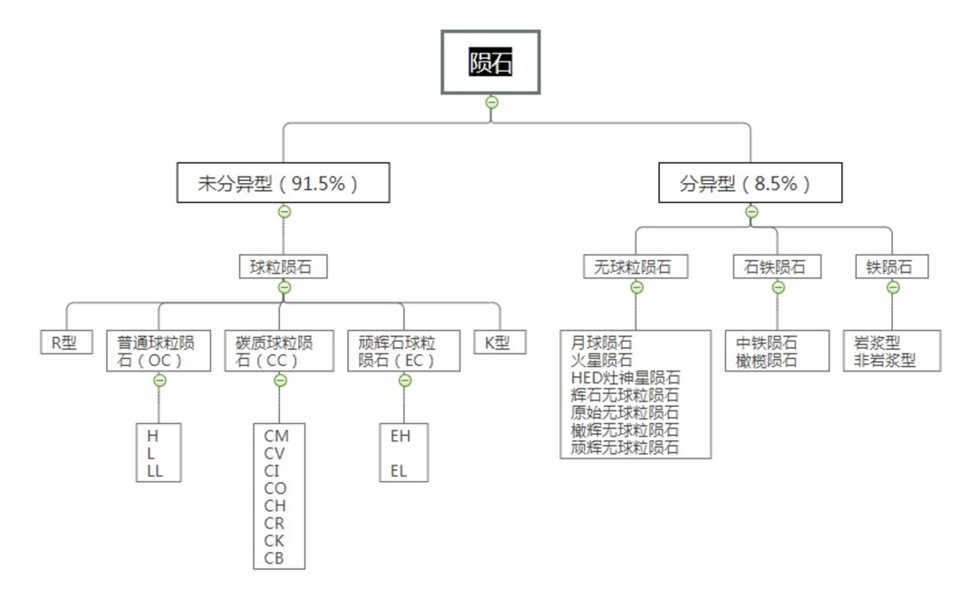 我们再来看看陨石的分类,这对于我们理解陨石的情况比较重要。我们主要谈论陨石的分异情况,这样的话,陨石主要分为两大类:球粒陨石和非球粒陨石。
