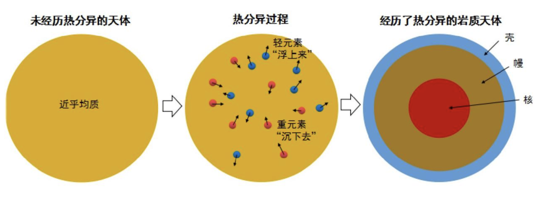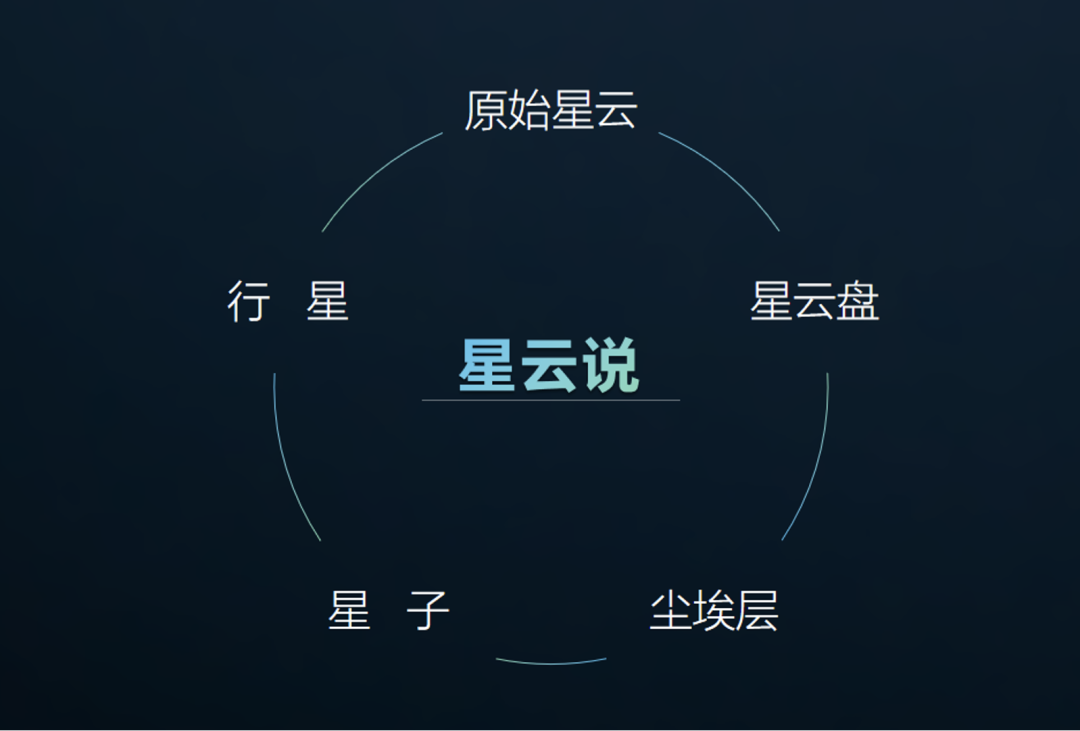 可能大家会比较疑惑,这里谈论到的分异是个什么变化呢?这就要涉及到我们的行星情况了,也就是说固体行星是怎么诞生的,譬如我们的地球。行星的形成涉及到一个经典学说——“星云说”(最早由康德提出)。这个学说的主要内容有五个部分:原始星云、星云盘、尘埃层、星子、行星。从一开始的原始星云,进一步收缩聚集成星云盘,之后形成尘埃层,由尘埃层再一步聚集为星子(原始的岩石聚集体等,也可以说是陨石的前身),最后星子不断地碰撞聚集,在引力的作用下形成原始行星,最终不断演化成为现在的行星。