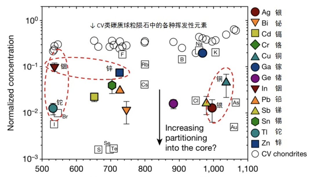 接着说,我们可以用热成核理论解释部分现象,但是还有部分现象解释不了了,就比如说研究人员进一步对比了地球硅酸盐质外层和CV类碳质球粒陨石中多种中等易挥发微量成分的含量,发现,比如说铟比锌更亲铁和亲铜,且凝聚温度更低,但两者的含量却差不多;铟比铊更亲铁亲铜,凝聚温度也差不多,但含量却比后者高得多。这是为什么?