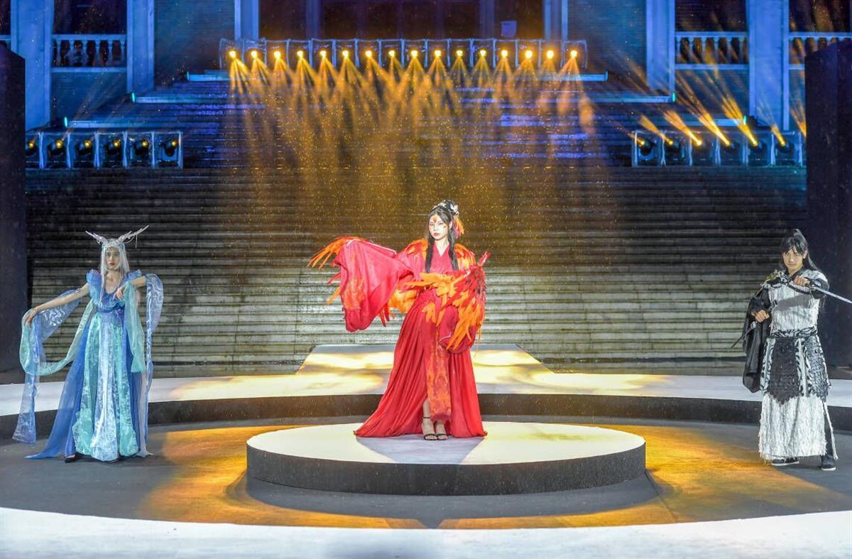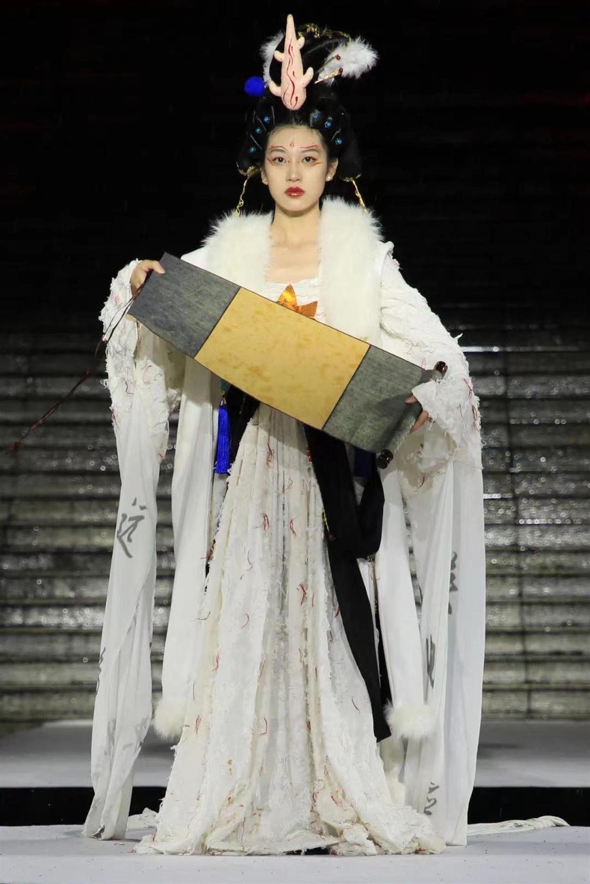 毕业生陈嘉怡的演艺服装设计作品《一天云烟》剪裁利落,配色经典,设计者结合中国传统戏曲元素和西藏地区服饰文化特色,对昆仑神话角色进行了大胆创新,不一样的神话形象让人物角色设定更加鲜明贴切。“这套戏服的设计非常用心,从花纹到配件都体现出了角色端庄霸气的一面。我作为模特一穿上这套衣服就立刻感受到了角色的气息,演绎起来也更加自信。”当晚参与该套服饰表演的19级服饰表演与推广方向学生吉歆雨介绍说。