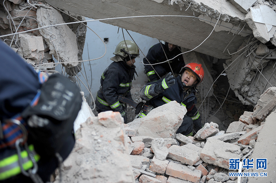 刘亮(右一)在建筑坍塌事故现场营救被困人员。 新华网发