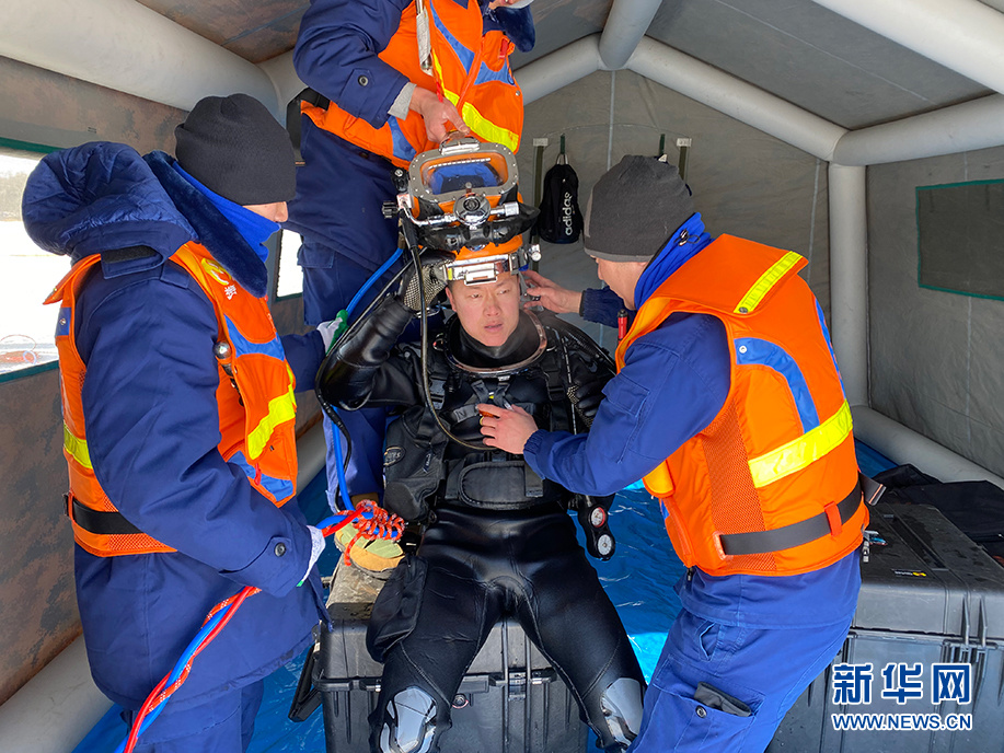 刘亮(中)穿戴潜水装备,准备实施冰下打捞。 新华网发