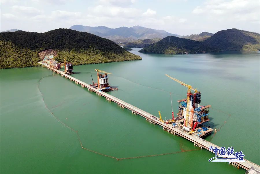 6月2日,全线控制性工程太平湖特大桥首个主塔顺利封顶。大桥全长926.1米,其中主桥长788米,采用双线三塔矮塔斜拉桥,两个主跨均为228米,为目前国内最大跨度的高速铁路多塔矮塔斜拉桥。