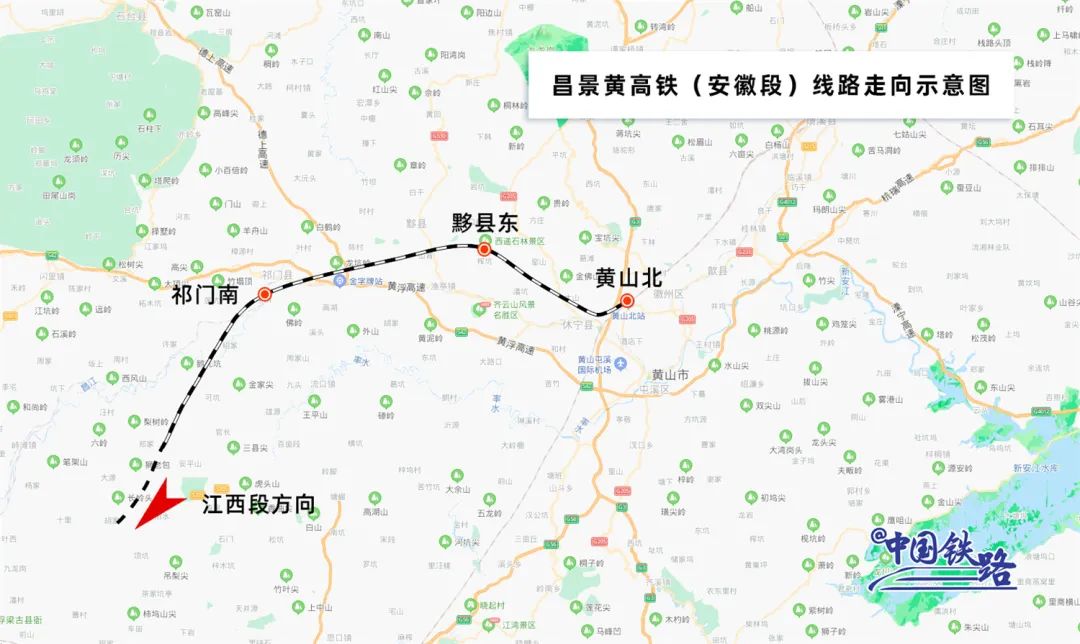 昌景黄高铁安徽段位于安徽省黄山市境内,途经安徽省祁门县、黟县、休宁县至黄山市,黄山北站和黟县东站是与池黄高铁交会的共用车站,全长89.6公里,设计时速350公里。