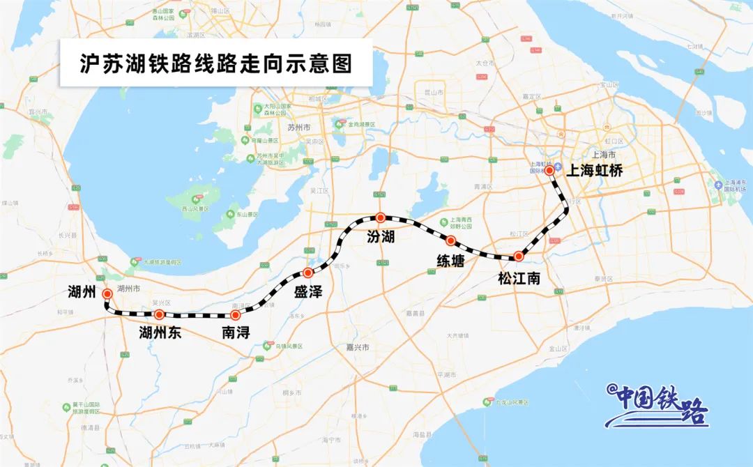 沪苏湖铁路起自上海虹桥站,途经江苏省苏州市,终至浙江省湖州市湖州站,正线全长约163.5公里,设计时速350公里,设上海虹桥、松江南、练塘、汾湖、盛泽、南浔、湖州东、湖州站等8座车站,其中上海虹桥站和湖州站为既有车站,其他为新建车站。