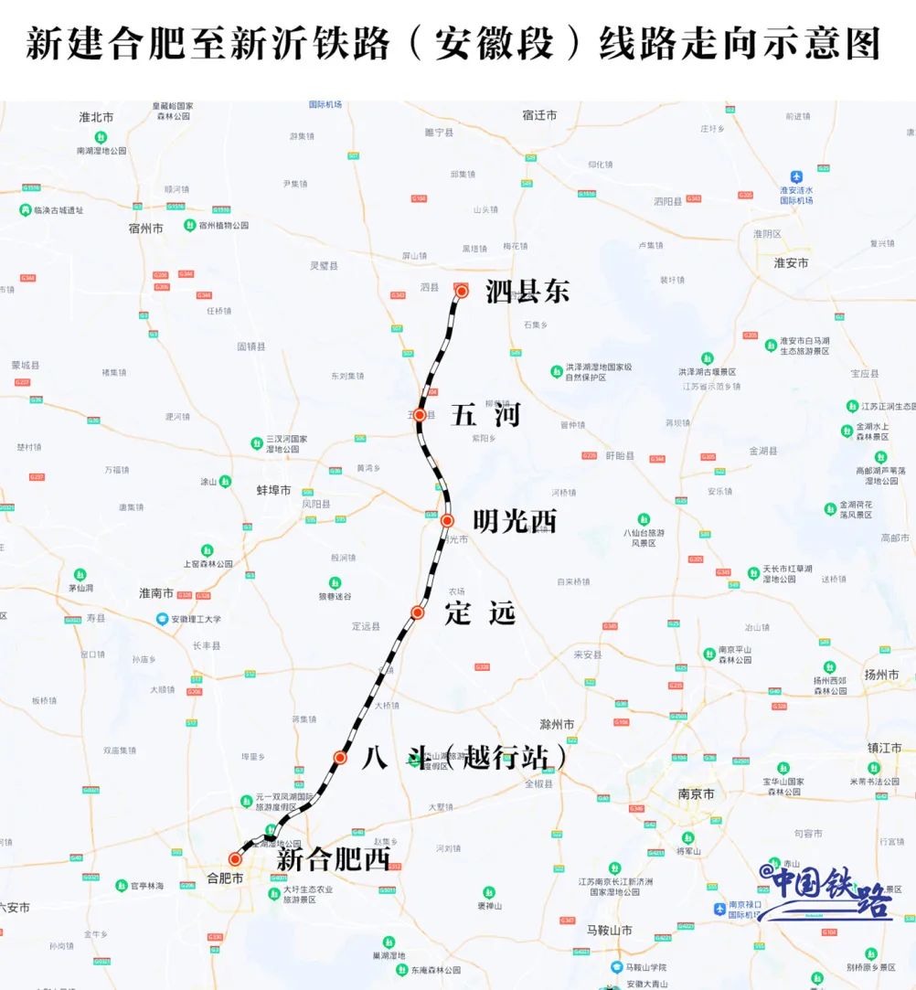 合新高铁安徽段位于合肥、滁州、蚌埠、宿州境内,全线共设泗县东、五河、明光西、定远(改扩建)、八斗(越行站)等车站,设计时速350公里,线路全长207.4公里。