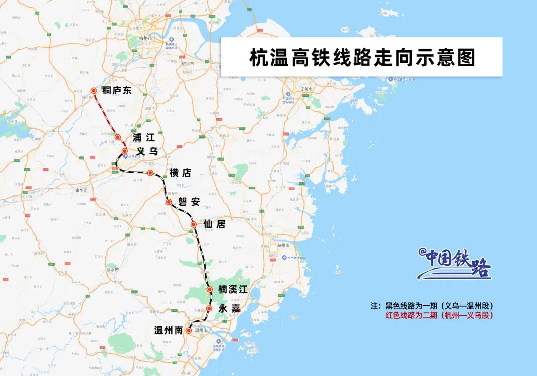 杭温高铁是一条连接浙江南北的诗画走廊,北起杭州市桐庐东站,引入改建后的温州南站,线路全长260公里,设计时速350公里,设桐庐东、浦江、义乌、横店、磐安、仙居、楠溪江、永嘉、温州南等9座车站。