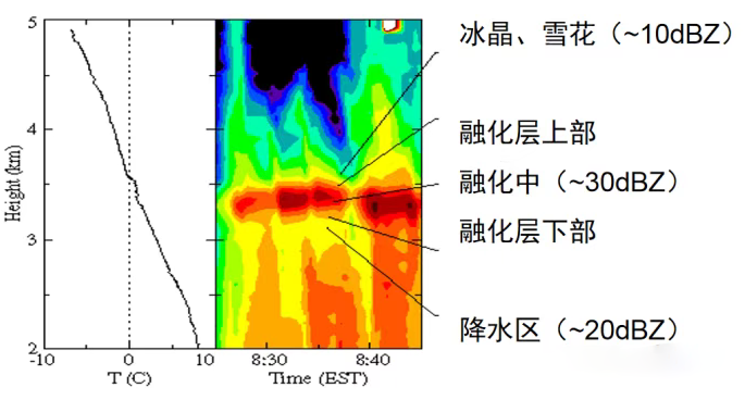 (2)降雪时,由于近地面温度常低于0℃,粒子不存在冰水转换过程,故不会出现零度层亮带。