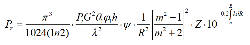 雷达回波强度由雷达自身参数和降水区的大气状态等因素决定,我们通常用雷达气象方程表示它: