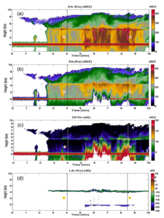 双频测雨雷达,顾名思义,就是可以发射两个不同波段电磁波的雷达,不同波段雷达在遇到同一目标物时探测到的信号不同,举个例子,图5中蓝色实线和红色实线分别代表Ku和Ka波段雷达探测到的降水回波信号,由于Ku波段较Ka波段波长更长(穿透能力更强),故它在遇到气象目标物时信号衰减较弱,探测到的雷达回波就更强。利用这种双波段探测信号差异,即双频比DFRm,可以进行亮带识别。我们可以看到对于层状降水(图5左),DFRm廓线(黑色虚线)有着清晰的峰值及上下边界,指示了亮带的存在,但对于对流降水(图5右),DFRm廓线没有这种特征,说明对流降水并不存在亮带。