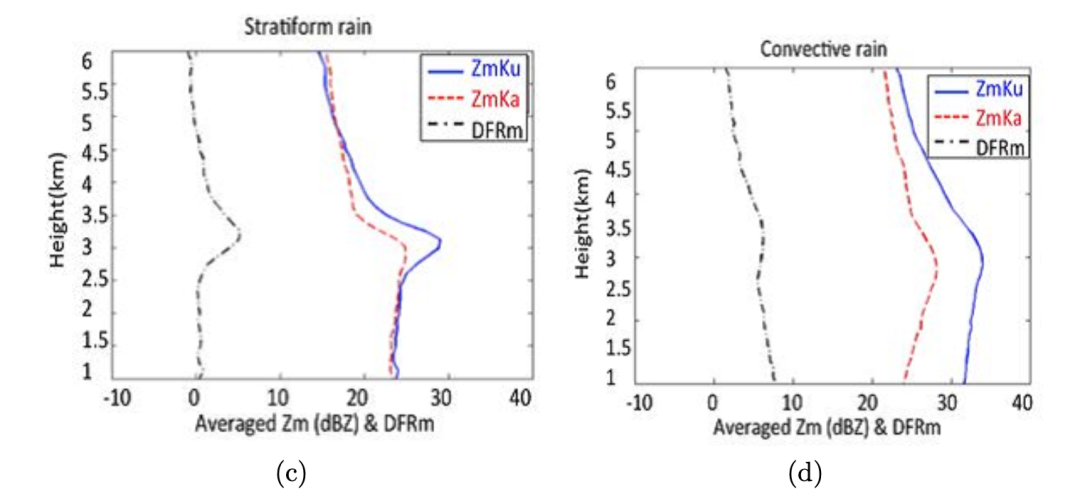 图5. 双频测雨雷达探测的层状(左)及对流(右)降水反射率因子廓线
