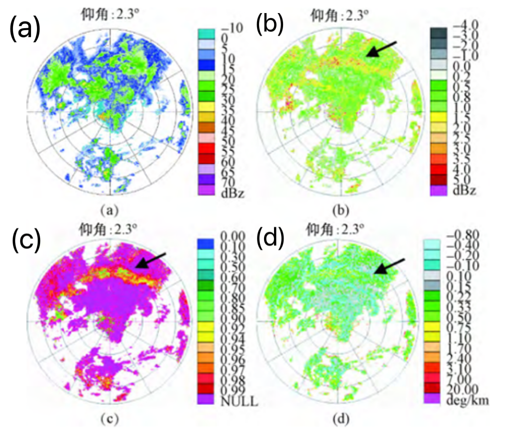 图6. C波段双偏振雷达各参量分布图(a:反射率因子Z,b: 差分反射率ZDR,c: 相关系数ρHV,d: 差分相位移率KDP)