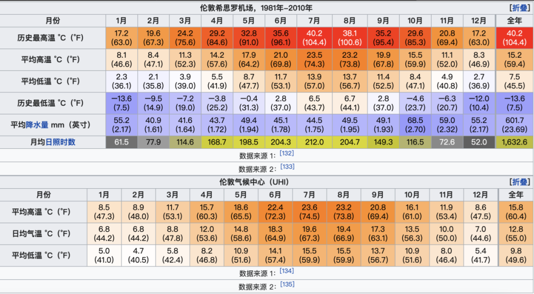 百科有关伦敦的气温纪录数据已经刷新,可以看出这次高温与历史平均高温之间有多么悬殊