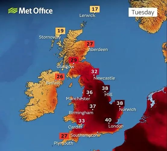 7月19日又是一个载入史册的一天,在英国,持续不过三年的高温纪录38.7摄氏度(剑桥大学植物园)在这一天被刷新为40.3摄氏度(林肯郡)!伦敦希思罗国际机场也刷出了自1840年有气象记录以来的最恐怖纪录——40.2摄氏度!