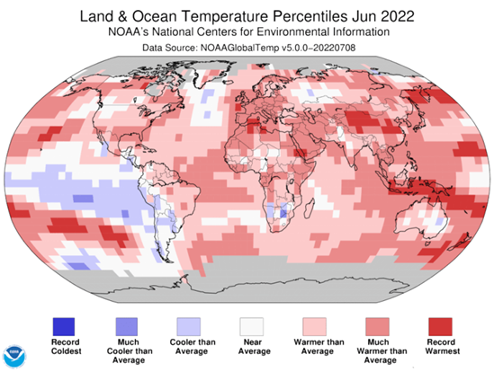 2022年6月气温异常情况,可见绝大部分地区气温都偏高,很多地方出现了历史新高(来源:NOAA)