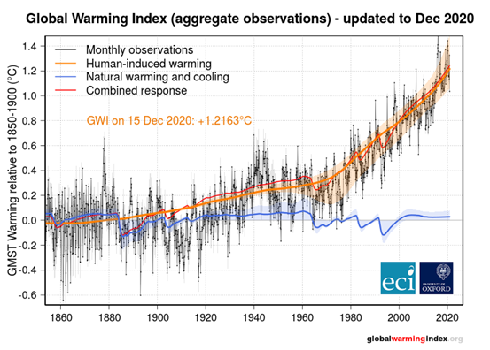 全球变暖指数趋势,到2020年已经达到1.2摄氏度(来源见水印)
