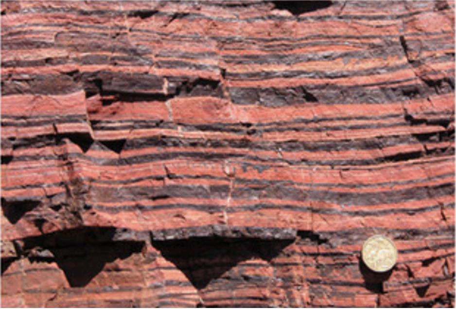 某些冰川单元出现了条带状铁建造(英文简称BIF,是一种特殊的海相富铁沉积岩,几乎只产出于前寒武纪,具有特征性的富硅-富铁交错条带,图2)条带状铁建造在18亿年前已经结束,而在十亿年之后,全球性的条带状铁建造沉积事件又重新出现。