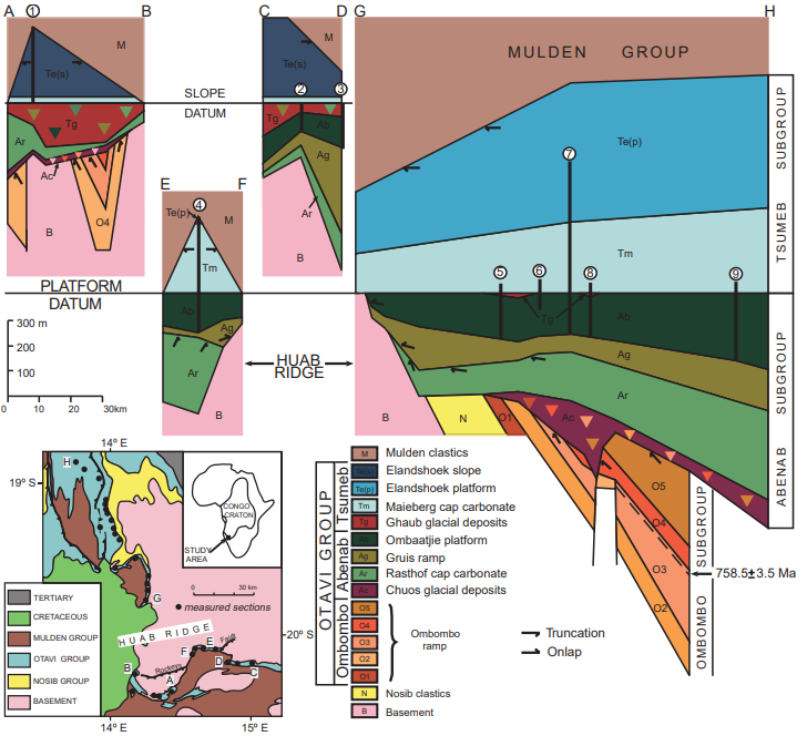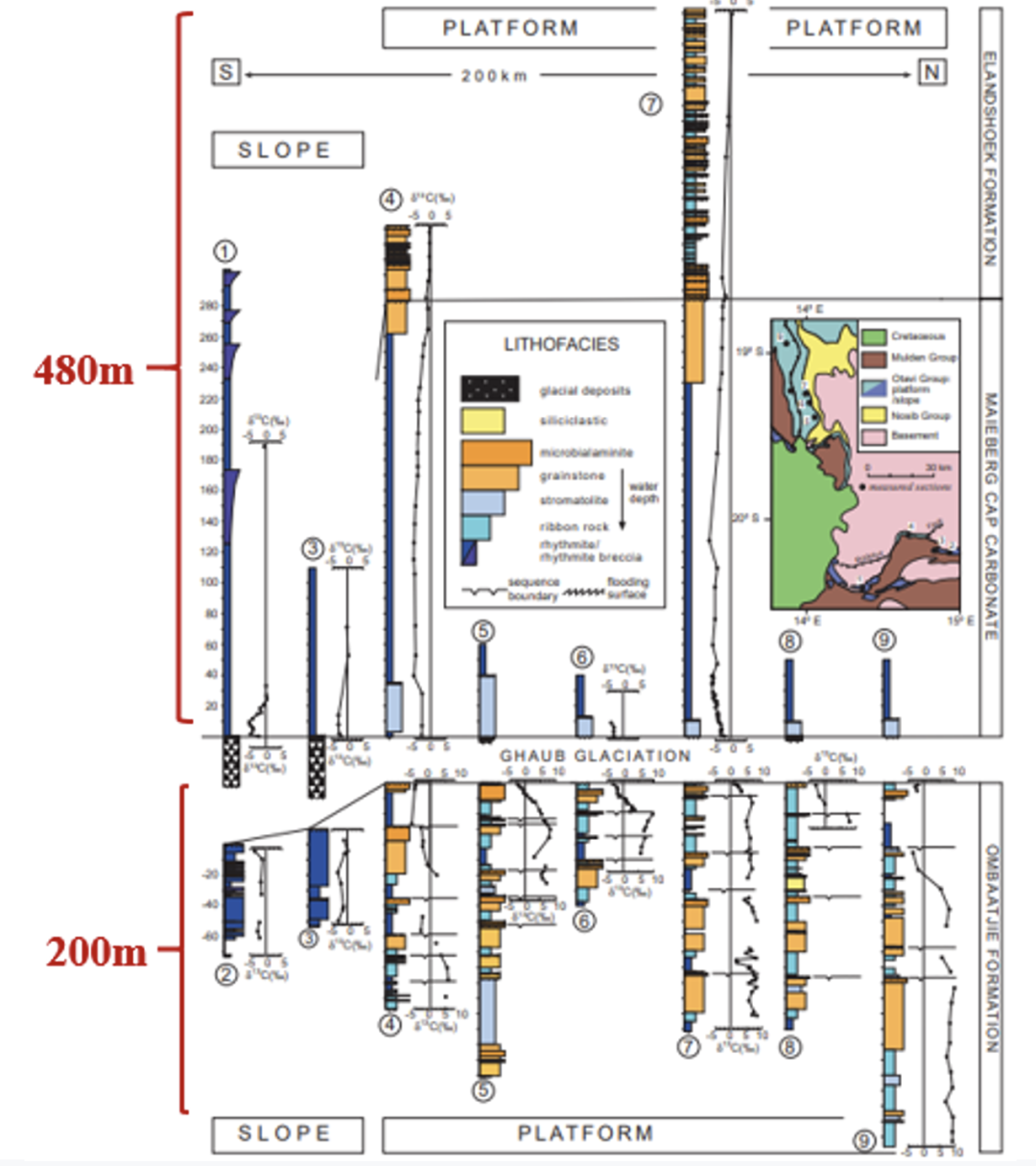 1998年,Hoffman对位于纳米比亚北部的刚果克拉通南部的Otavi组地层的一个碳酸盐岩台地做了研究,主要研究的地层包含Sturtian时代的两个分离的冰期单元:Chuos和Ghaub组。(Sturtian:约760-700Ma,属于成冰纪的一个时期,成冰纪共包括四次全球冰川事件:Sturtian、Varangian、Smalfjord、Mortesnes)两个单元下为碳同位素值较高的厚碳酸盐岩层,两个单元之上被独特的帽碳酸盐岩覆盖,上下之间的差异便记录了碳同位素的负漂移。