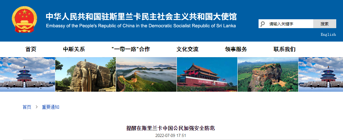 7月9日,中国驻斯里兰卡大使馆官网发布重要通知:提醒在斯里兰卡中国公民加强安全防范。