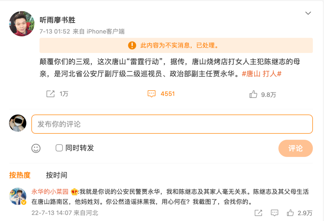 河北省公安厅政治部副主任公开喊话:“我和唐山打人者陈继志及其家人毫无关系”