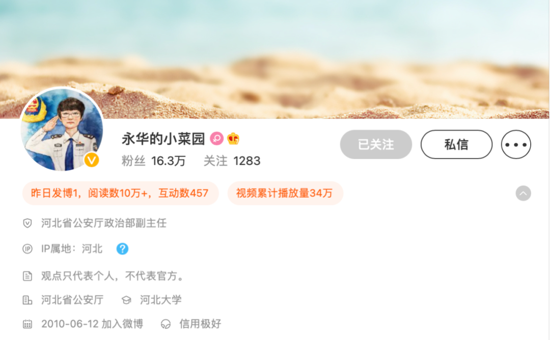 @永华的小菜园 是河北省公安厅政治部副主任贾永华实名认证的微博,目前粉丝为16.3万。