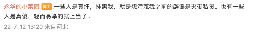 7月12日,她曾在一条转发的微博中写道,“一些人造谣抹黑我,就是因为我不断辟谣,戳穿了他们的诡计。我现在开始搜集证据,会追究一些恶意造谣者的法律责任的。”