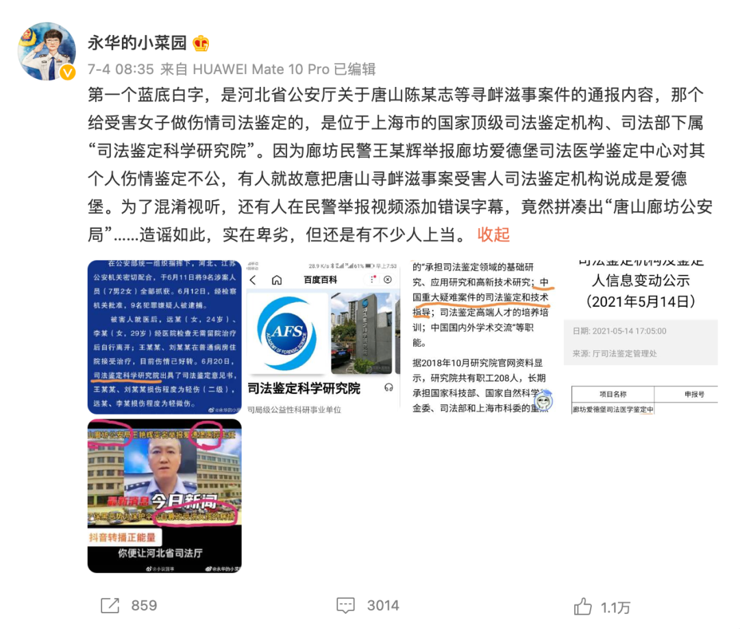 北京青年报记者注意到,贾永华在置顶的一条微博中写道,“因为廊坊民警王某辉举报廊坊爱德堡司法医学鉴定中心对其个人伤情鉴定不公,有人就故意把唐山寻衅滋事案受害人司法鉴定机构说成是爱德堡。为了混淆视听,还有人在民警举报视频添加错误字幕,竟然拼凑出‘唐山廊坊公安局’……造谣如此,实在卑劣,但还是有不少人上当。”