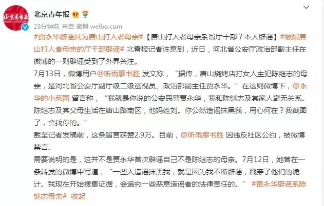 7月13日,微博用户@听雨廖书胜 在微博发文称,“据传,唐山烧烤店打女人主犯陈继志的母亲,是河北省公安厅副厅级二级巡视员、政治部副主任贾永华。”