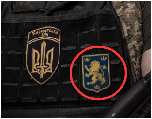 因为根据这家俄媒的说法,这个名叫“Mikhail”、来自乌克兰第49步枪营(“喀尔巴阡山西奇”营)的27岁士兵,所佩戴的那个狮子形状的徽记,居然是纳粹德国时期“纳粹党卫军第十四武装掷弹兵师”(14th Waffen Grenadier Division of the SS)的徽记。