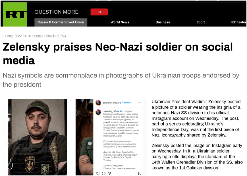 8月24日是乌克兰的“独立日”。当天,乌克兰总统泽连斯基在他的官方社交账号上发帖庆祝这一日期时,贴出了一组乌克兰士兵的照片,以感谢为乌克兰的“自由”而战的年轻战士。然而,俄罗斯媒体“今日俄罗斯”却指控说,其中一名士兵佩戴的徽记,是纳粹德国时期一支由乌克兰极端民族主义者组成的纳粹党卫军部队的徽记。