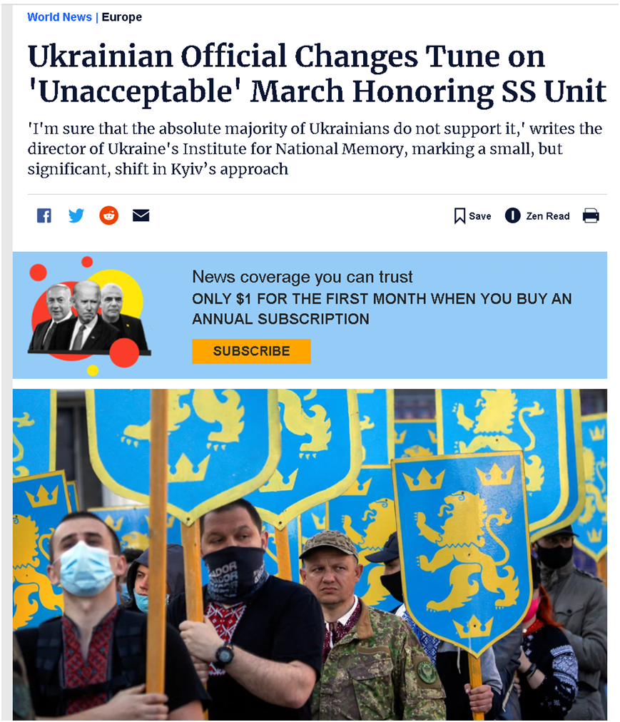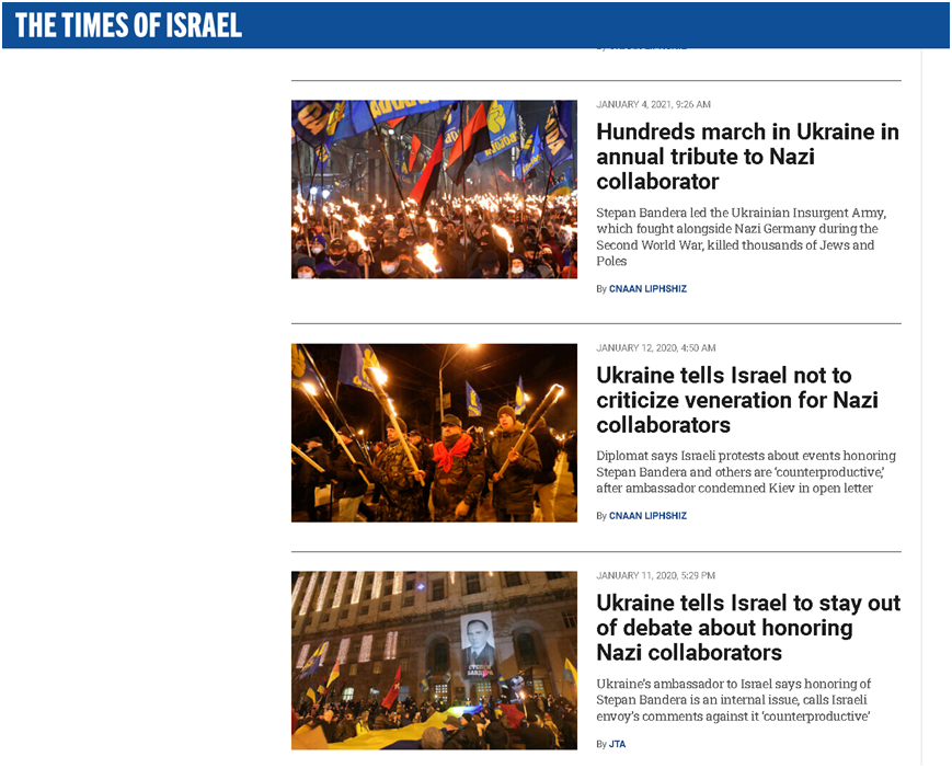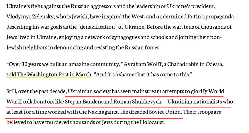 总部位于美国纽约的“犹太电讯社”在今年4月28日的一篇报道中就指出,尽管乌克兰总统泽连斯基本身是犹太人,也有不少犹太人在乌克兰与俄罗斯爆发此次军事冲突前生活在乌克兰——而且这些情况还成了西方反驳俄罗斯指控乌克兰“纳粹化”的一些说辞,但是乌克兰的“主流社会”里也确实存在着希望为纳粹时期的乌克兰极端民族主义者班德拉等人招魂和洗白的情况。