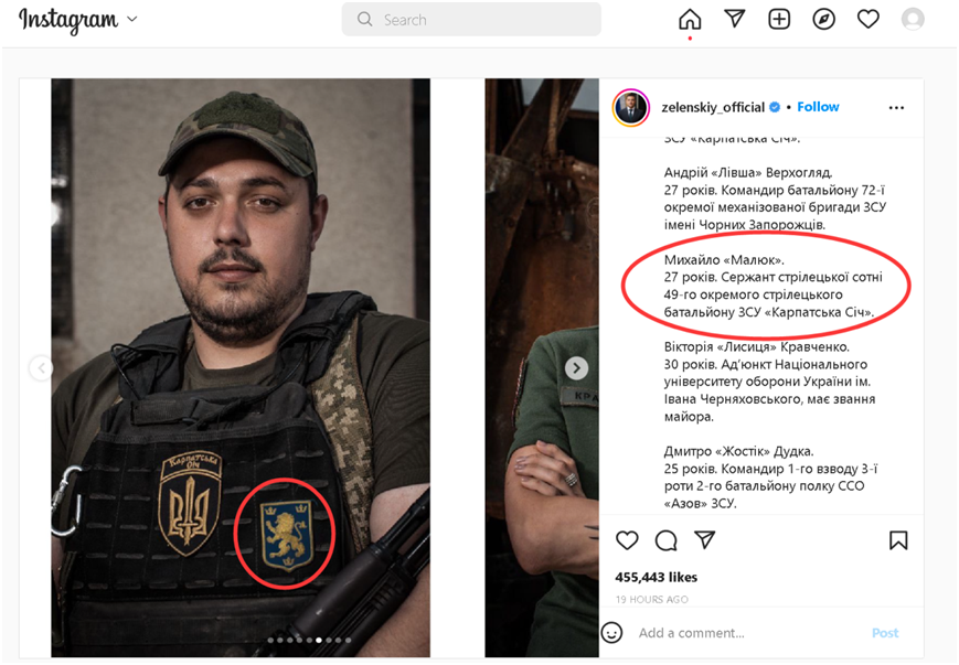 (图为乌克兰总统泽连斯基在乌克兰独立日当天贴出的一组士兵照片,其中图中这名士兵的胸前的一个狮子形状的徽记引发了争议)
