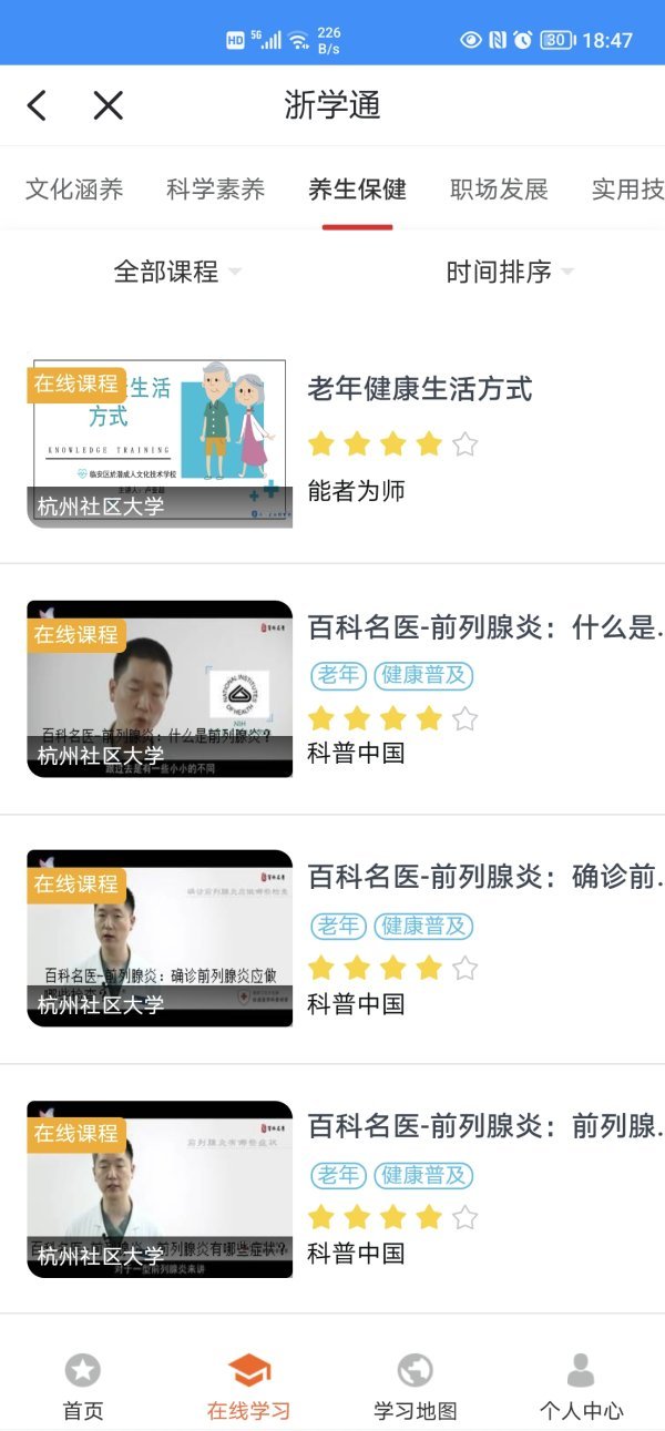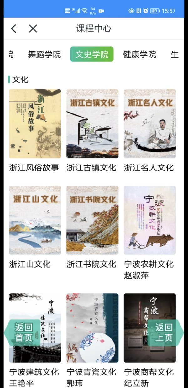 相关部门将一些公共教育课程以视频、音频等数字资源形式上传到“浙学通”。点击“浙学通”页面底部的“在线学习”图标,即可进入在线学堂,其中包括“文化涵养”“科学素养”“养生保健”等10多个栏目海量课程。