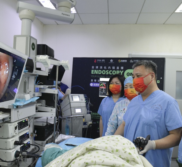 消化医院智造“内镜精灵”惊艳全球。图为于红刚教授在全球内镜手术直播中代表中国作手术演示。