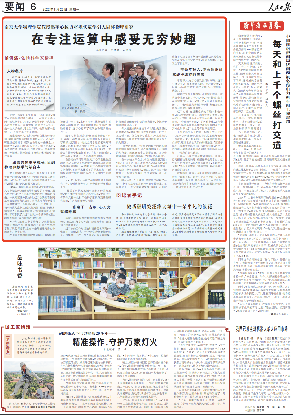 2022年8月22日,《人民日报》第06版“讲述·弘扬科学家精神栏目”,刊登了题为《南京大学物理学院教授赵宇心致力将现代数学引入固体物理研究——在专注运算中感受无穷妙趣》的深度报道。全文内容如下:
