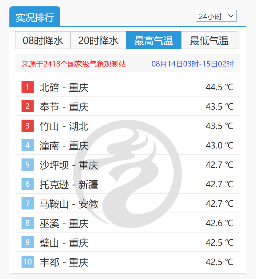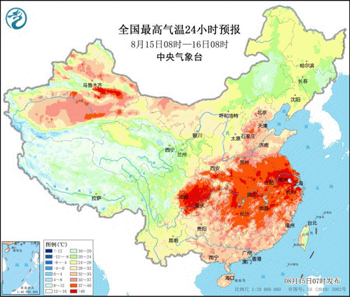 预计,8月15日白天,新疆吐鲁番盆地和南疆盆地、陕西、山西、河北、北京、山东、河南、安徽、江苏、上海、湖北、湖南、江西、浙江、福建、四川、重庆、贵州、广西、广东等地部分地区最高气温将有35至39℃。其中,四川、重庆、陕西、河南、安徽、江苏、湖北、湖南、江西、浙江以及新疆吐鲁番盆地等地的部分地区最高气温可达40℃以上。