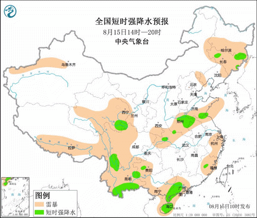 预计,8月15日08时至16日08时,吉林、河南、安徽、江苏等地的部分地区有大雨或暴雨(25至90毫米)。上述部分地区伴有短时强降水(最大小时降雨量30至60毫米,局地可超过80毫米),局地有雷暴大风或冰雹等强对流天气。