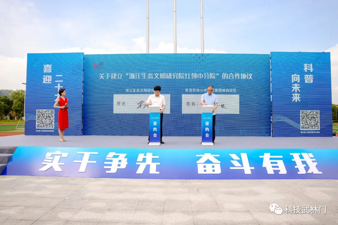 朱利中院士与安吉县实验小学教育集团城西校区签订了建立“浙江生态文明研究院红领巾分院”的战略合作协议。浙江大学教授唐建军作《全球变化与生物碳中和》的科普讲座。活动现场还举办了丰富的展览展示活动及进行了图文直播。