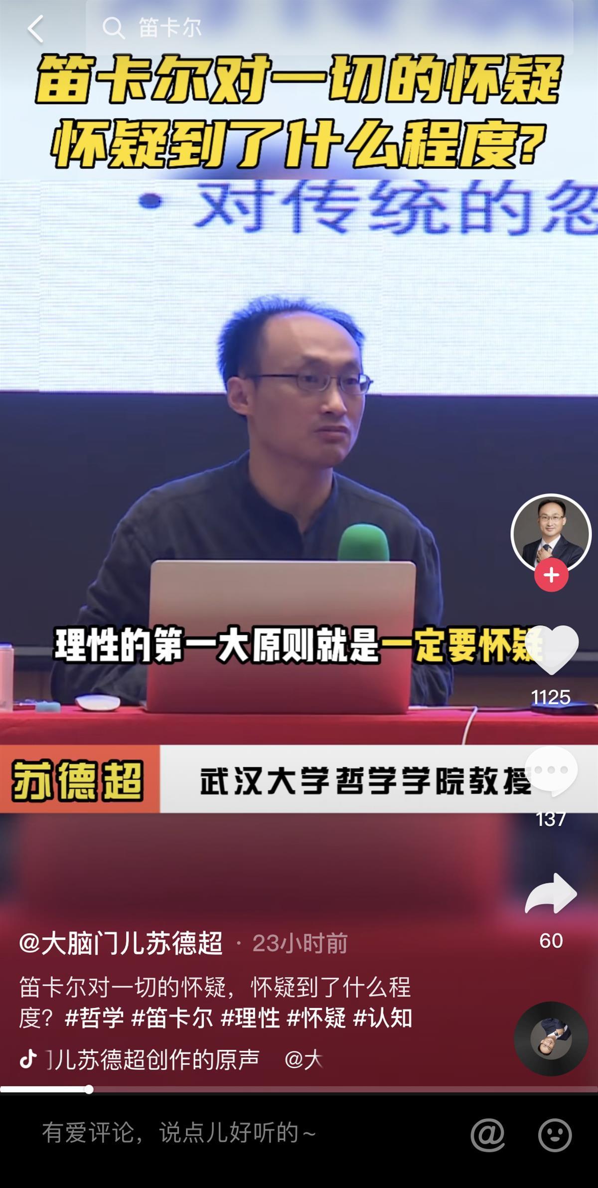 9月28日,@大脑门苏德超 抖音账号上,一条《笛卡尔对一切的怀疑,怀疑到了什么程度?》哲学课短视频,发布后数小时便已引来上百位网友在评论区思考和探讨。而这只是@大脑门苏德超 抖音账号今年以来发布的众多哲学短视频之一。