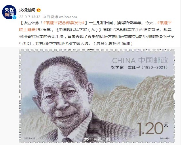 一生躬耕田间,换得稻香丰年。今天,袁隆平院士诞辰92周年,《中国现代科学家(九)》袁隆平纪念邮票在江西德安首发。邮票采用素描写实的表现手法,背景表现了袁老的科研方向和研究成果↓该系列邮票迄今已发行九组,共有38位中国现代科学家入选。(总台记者杨萍 满帅)