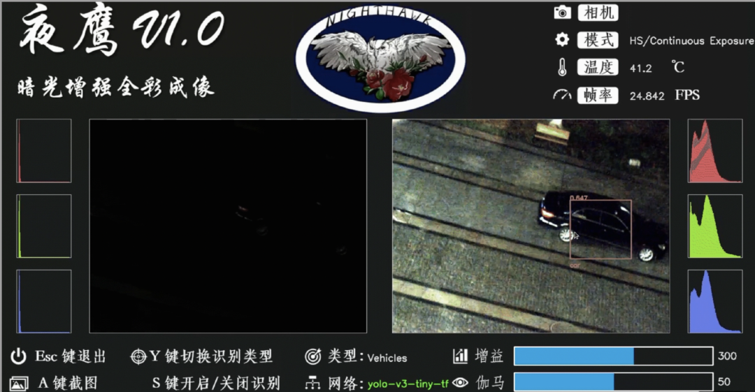 “夜鹰”暗光增强全彩成像系统针对用户的具体使用场景进行了进一步的功能开发。通过“夜鹰”UI界面,用户可以查看实时的相机直出图像和增强恢复后图像,并查看图片色彩直方图、视频实时帧率等信息,进行画面缩放、相机参数调节、保存当前画面为图片等操作。同时,“夜鹰”内置了针对高达80种不同类别物体的人工智能图像识别系统,可根据应用场景帮助用户快速捕捉并框选画面中出现的目标。