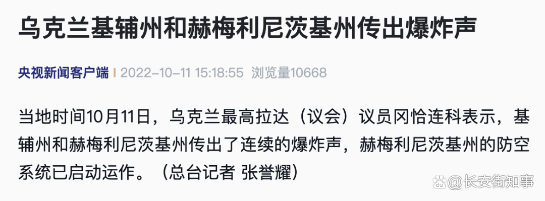 据央视新闻客户端报道,当地时间10月11日,乌克兰全境响起防空警报。乌克兰最高拉达(议会)议员冈恰连科表示,基辅州和赫梅利尼茨基州传出了连续的爆炸声,赫梅利尼茨基州的防空系统已启动运作。