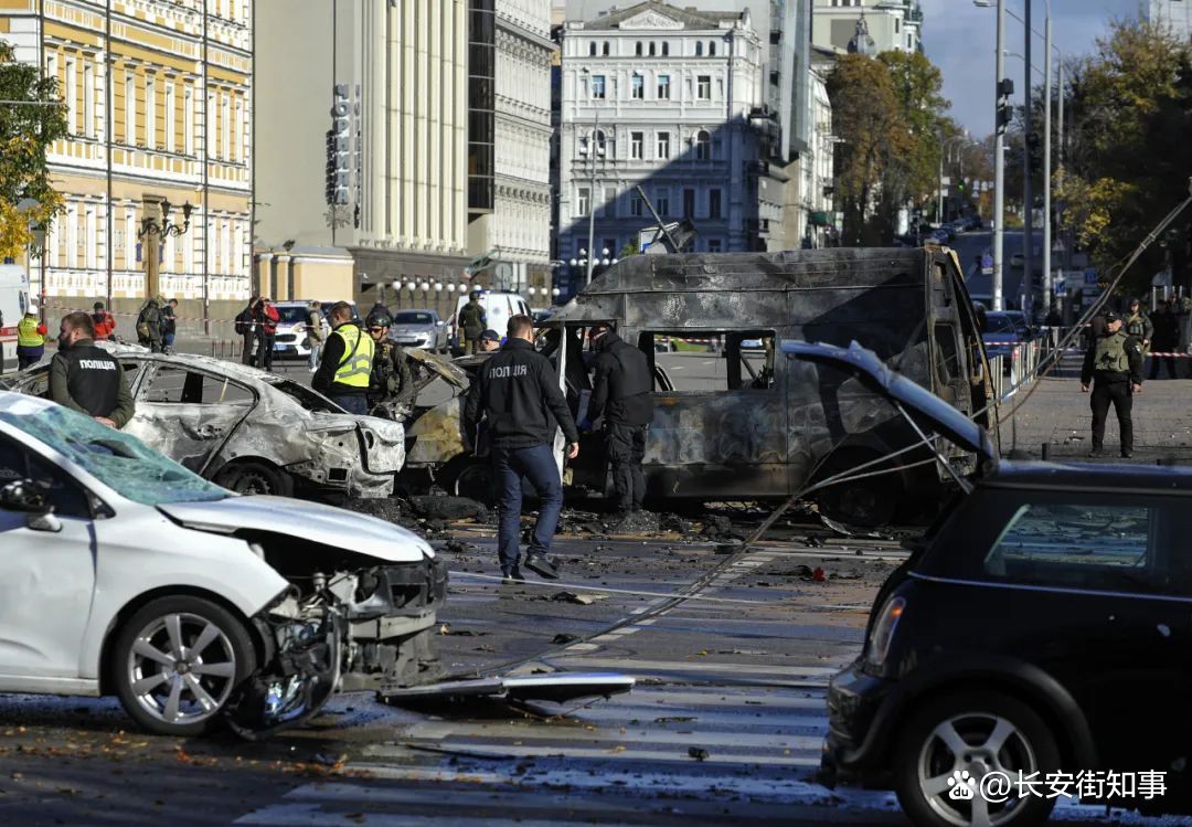 10月10日,警察在基辅市中心被火箭弹袭击损坏后烧毁的汽车附近进行调查。图源:视觉中国