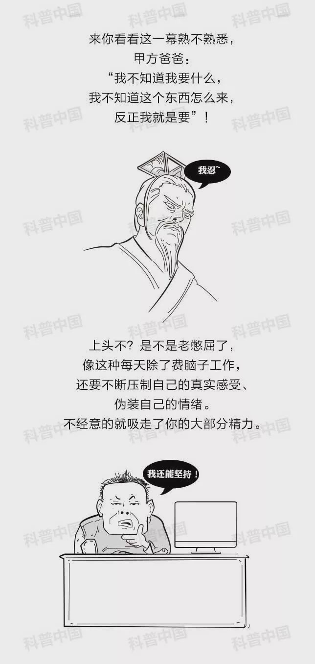 后来社会学家扩大了它的定义,即不管你处于哪个行业,只要涉及人际互动,都可能需要进行情绪劳动。比如:你辛苦为客户设计的方案被毙了,自己一肚子苦水吐不出但也只能憋着闷气重新做……