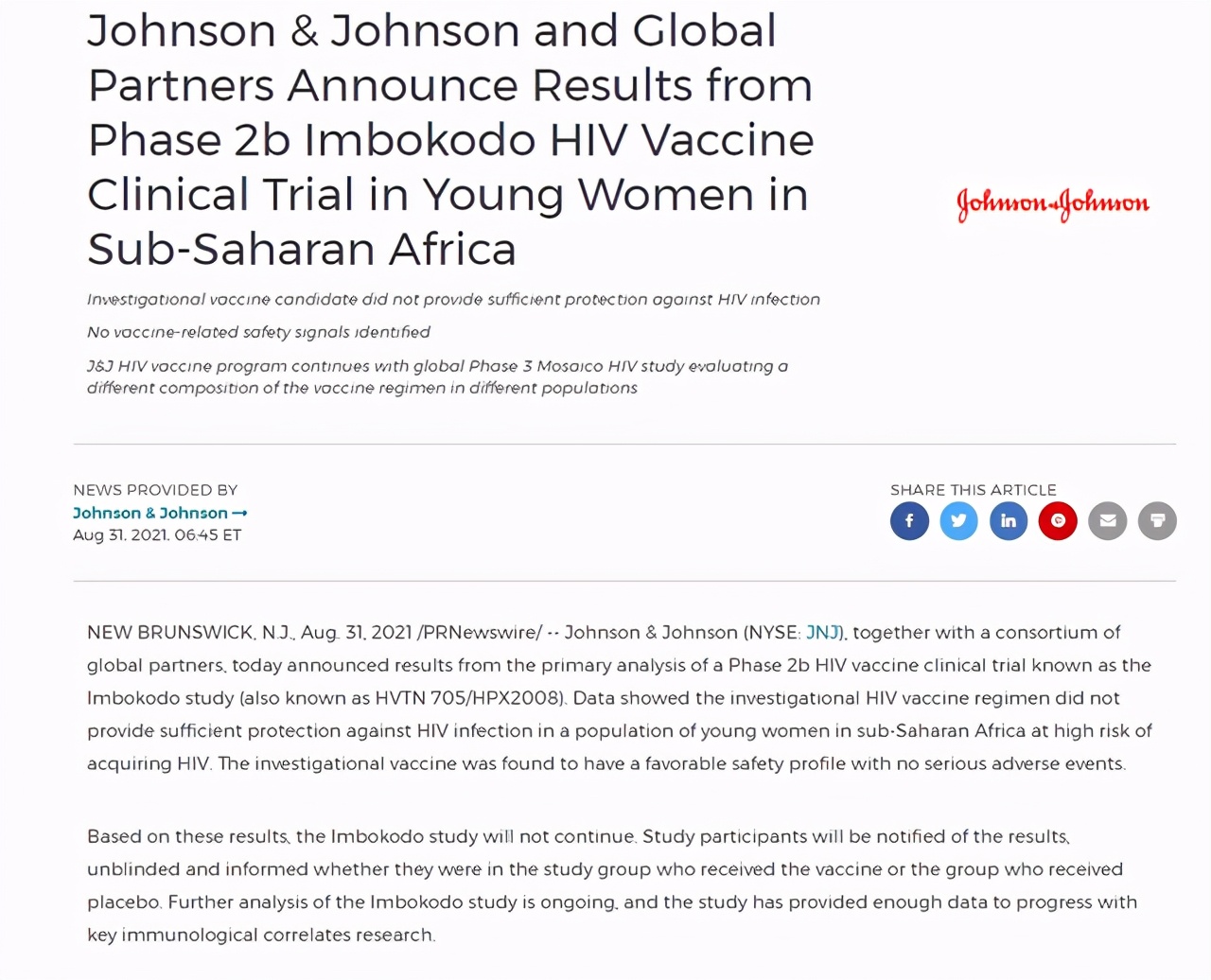 强生HIV疫苗试验又失败了,有效性仅25.2%