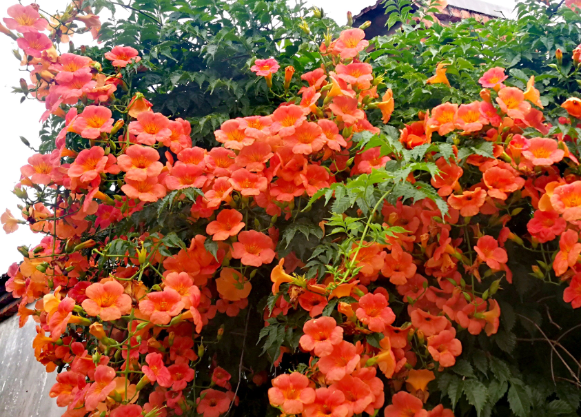 凌霄花可以说是爬藤之王,他在家庭中栽培一般都是选择地栽,他耐寒性能非常强,零下20到30度都冻不死它,而且养护起来非常的简单,它的花期是在夏季的时候开花,品种也有好几个,有黄色、粉色以及橙色,花期非常长,能够开整个夏天,花量也非常的大。他是非常适合在院子里栽培的,你只需要找一个靠墙的地方把它栽上,它藤条长出来以后自己就会伸出气生根来粘到墙上去往墙上生长,一棵苗子只要不是太小,一年的时间就能够爬满整面墙,到了第二年夏季开花的时候绝对非常的壮观。