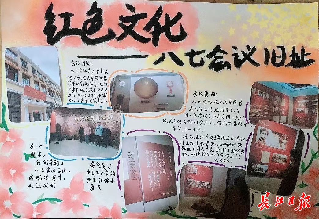 “在‘八七会议会址纪念馆’,我看到了瞿秋白用过的物品,看到了复原后的会场,被深深震撼了。历史就在我的面前,用无声的语言告诉我革命从来就不是一帆风顺的,中国共产党不断总结经验教训,才有了伟大的历史转折和最后的胜利。”这是八(1)班戴雪菲写在笔记本中的一段话。这个寒假,她和4名同学组成了探访小组,走进武汉红色遗迹,共同完成一份“红色武汉”手抄报。在她的班里,40余名同学分为7个小组,以“红色武汉”“生态武汉”“武汉文化”“武汉的奋斗者”等为主题,走进博物馆、走上街头,通过体验、探访、采访等形式完成各组作品。