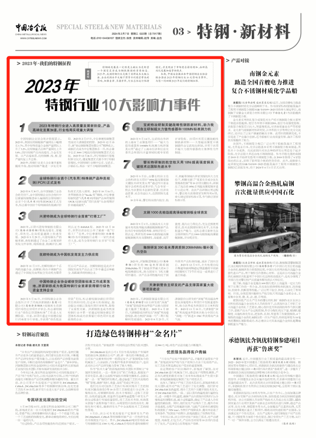 本期,中国冶金报社和中国特钢企业协会联合推出2023年特钢行业10大影响力事件,与您一同回顾2023年我们的特钢征程。